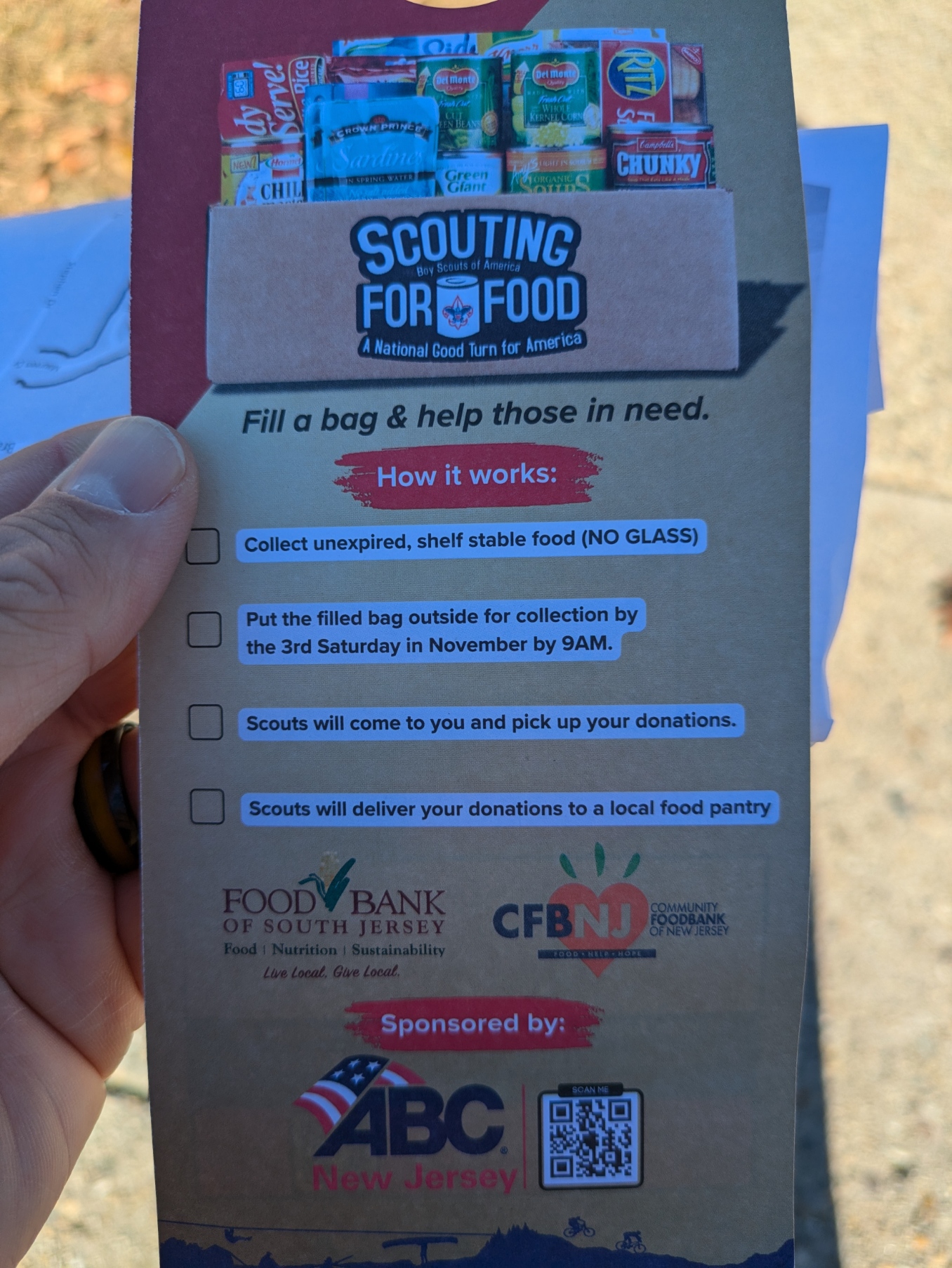 If you miss the drop off time, deliver directly to the Food Bank of South Jersey at 692 Rancocas Road Westampton, NJ 08060