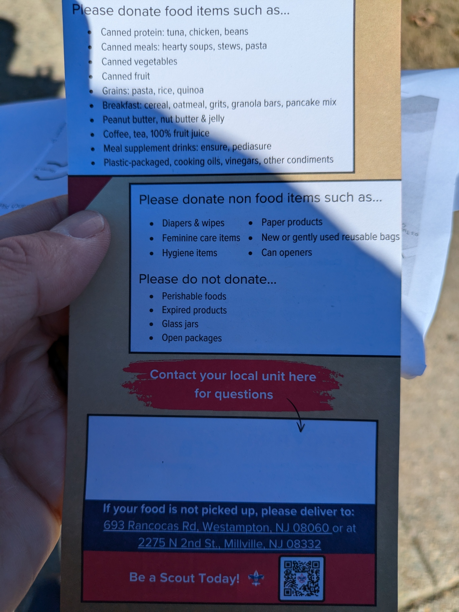 ALl items are then delivered to our rally point. Scout leadership will share the address. You will be asked to drop off all food, a count of items, and how many hours scouts and adults volunteered.